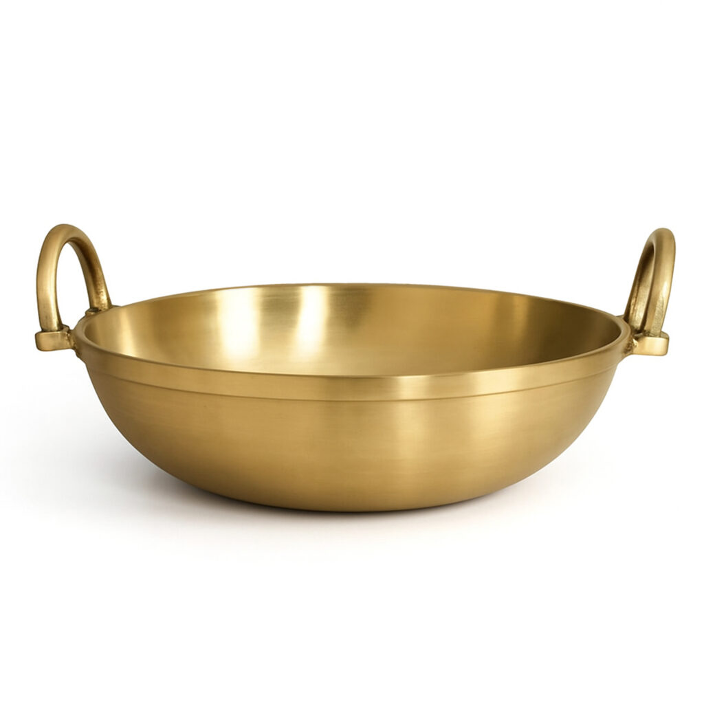 A Brass Kadhai is a cooking pot made from brass metal. It is round and deep, with thick walls and handles on the sides. It is used in Indian kitchens for making curries, frying snacks, and cooking sweets. The brass metal helps in cooking food evenly and gives a tasty and rich flavor to the dishes. Many families still use a brass kadhai because it is strong, safe, and lasts for a long time.